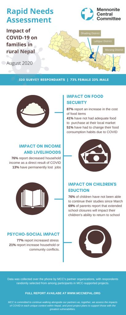 Impact of COVID on Rural Communities in Nepal Posted on September 10, 2020September 10, 2020 by MCC Nepal The full Rapid Needs Assessment report can be viewed or downloaded here. Share this: Click to share on X (Opens in new window) X Click to share on Facebook (Opens in new window) Facebook Like Loading...